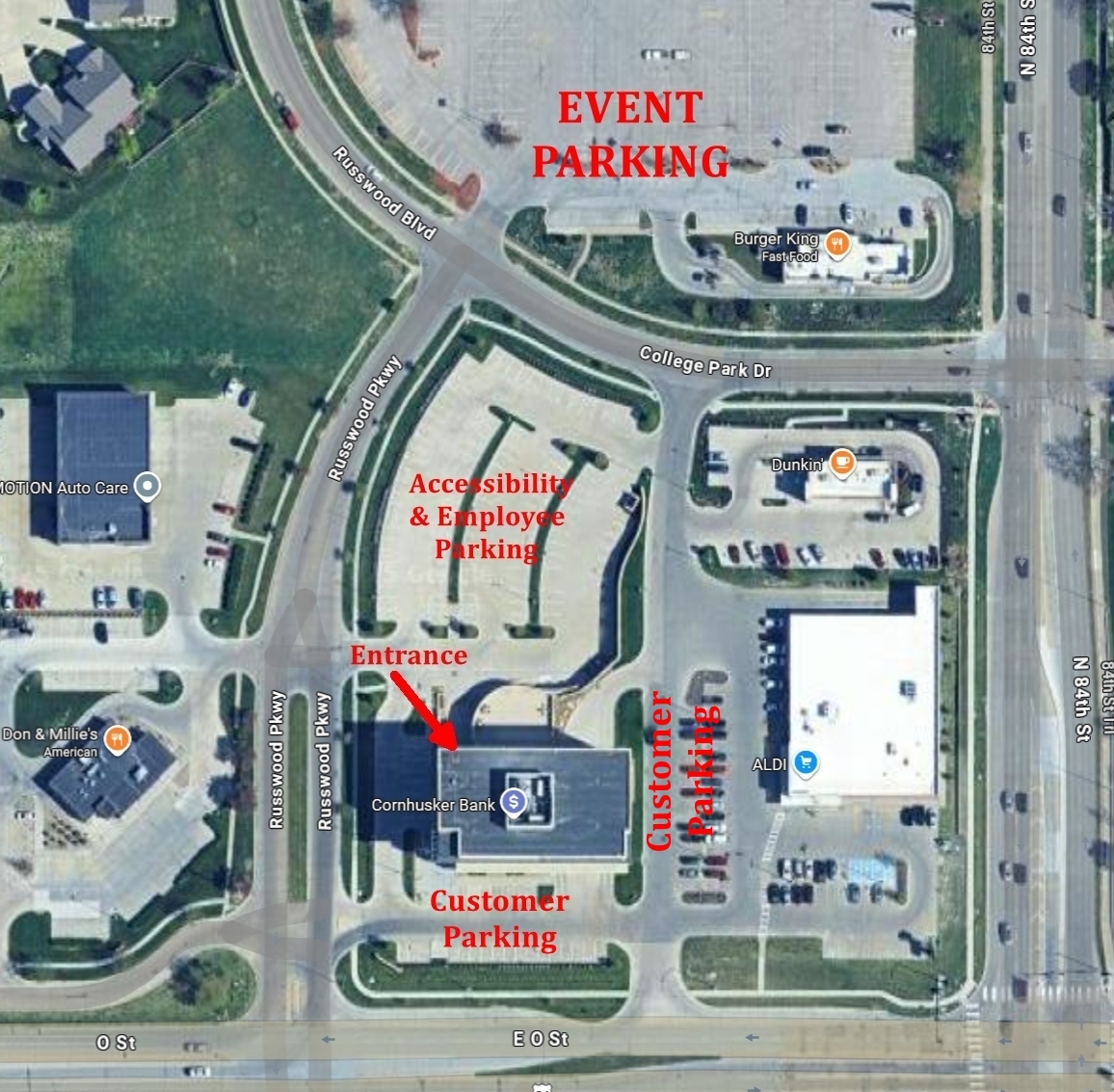 Parking for daytime Community Room guests is on the north (back) side of the building in the Kohl’s lot just north of the bank’s Employee Parking Lot. Please do not park in the Customer Parking Areas. A few parking spots for those with handicap permits are available in the Employee Parking Lot just north of the building. Others with limited mobility can be dropped off at the stairs/ramp that lead down to the community room entrance. Please view the DAYTIME PARKING MAP